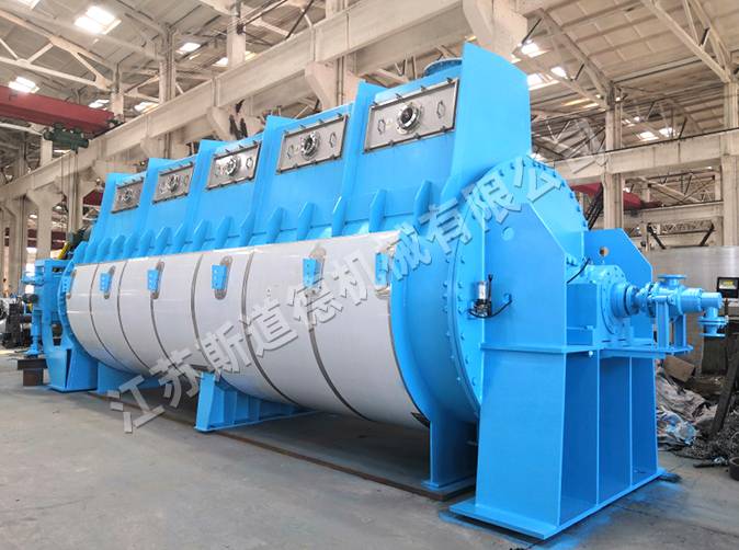 PSD型圆盘式干燥机不仅外壳可进行加热,同时内部转子也进行加热,大大增加了干燥面积,提高热效率,确保物料彻底干燥。干燥机是由一个横卧的外壳和一个带有加热的转子所组成,转子上安装多个加热盘片,盘片上装有可调节角度的推料器,在工作时既能加热物料,又可将物料沿出料端方向推进。转轴内部的蒸汽分布装置能使蒸汽均匀地分布到每一件加热盘片内,蒸汽在盘片内流动,使加热盘片保持恒定的温度,冷凝水通过轴端特殊的装置排出。该设备干燥效率高,使用寿命长,维修频率低。广泛用于市政污泥、工业污泥、动物蛋白、植物蛋白、食品、化工、农药等高含水量和高粘度物料的干燥,根据不同的物料物性,材质可选用碳钢、304、316L、2205等。