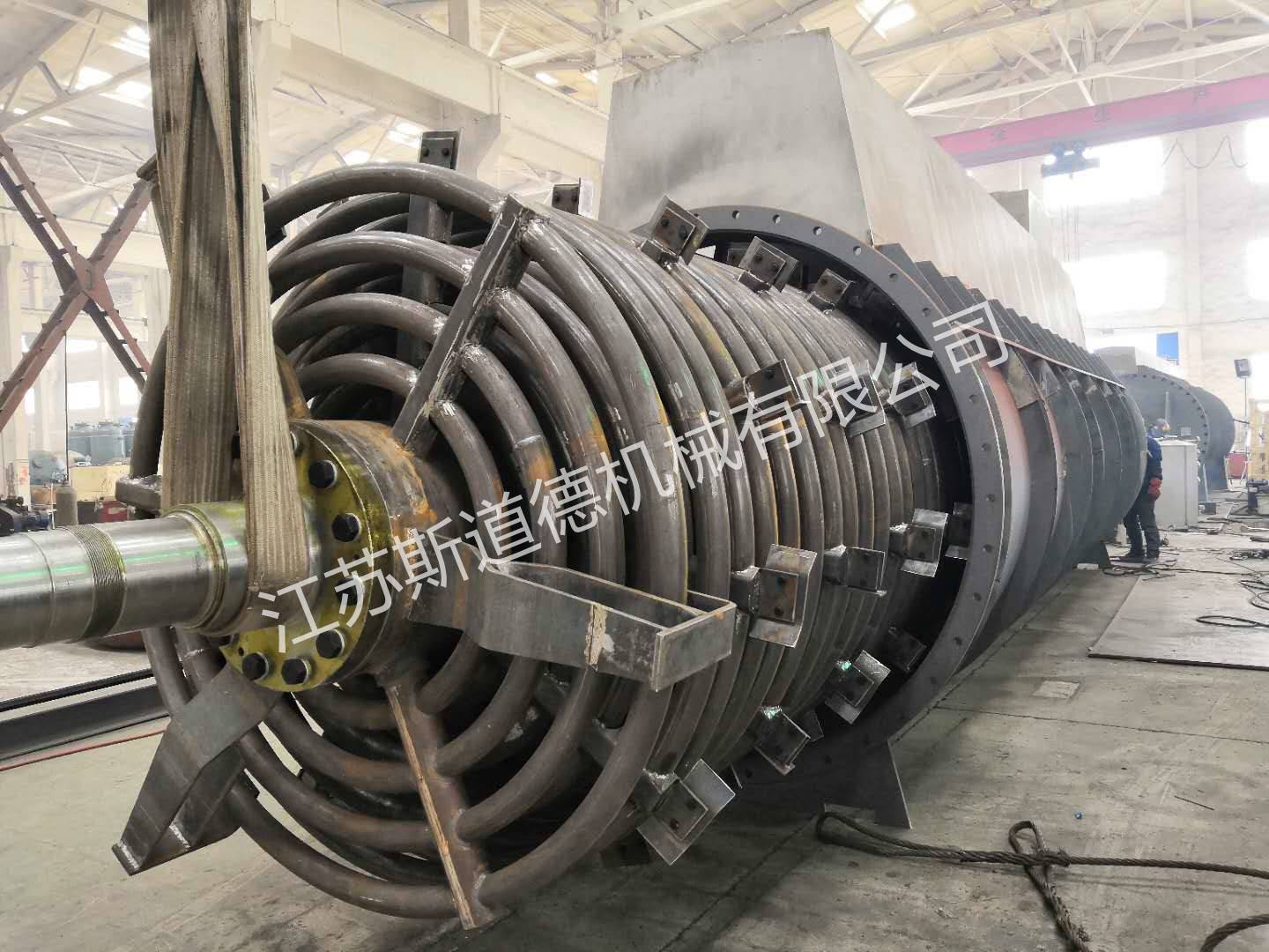 PGD型盘管式干燥机不仅外壳可进行加热,同时内部转子也进行加热,大大增加了干燥面积,提高热效率,确保物料彻底干燥。干燥机是由一个横卧的外壳和一个带有多套加热管的转子所组成,转子上安装多个加热管,管上装有可调节角度的推料器,在工作时既能加热物料,又可将物料沿出料端方向推进。转轴内部的蒸汽分布装置能使蒸汽均匀地分布到每一件加热盘管内,蒸汽在盘管内流动,使加热盘管保持恒定的温度,冷凝水通过轴端特殊的装置排出。