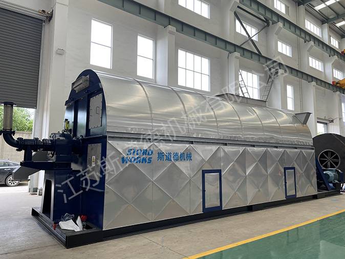 GSD型管柬干燥机结构为国固定的壳体内安装可转动的加热管束。蒸汽通过旋转接头进入管内传热变为冷凝水排出,物料中的水分在管外受热变成蒸汽,由负压风机排出,物料在管束内被转动的料铲抛洒,均匀落至加热管外表面,并从进料口端由料铲推动至出料口端,从而达到良好的干燥效果。